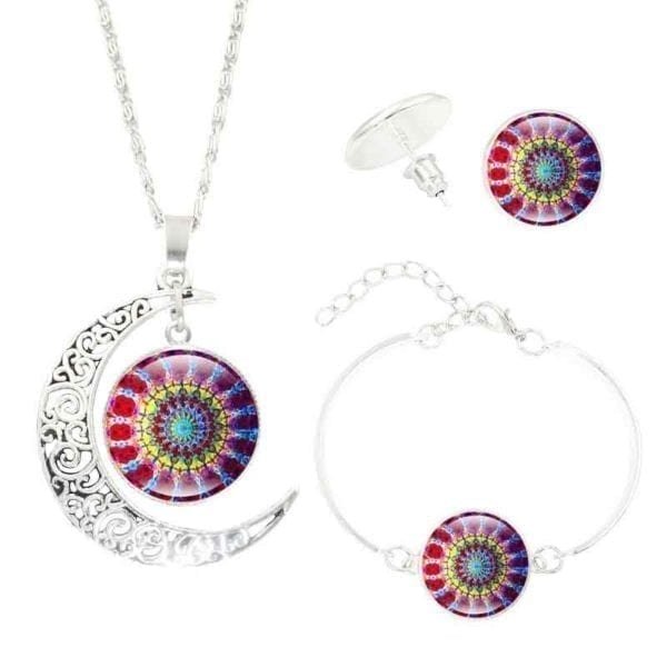 Mandala Bohemian Crescent Moon Necklace Bracelet and Earring 3pcs Set