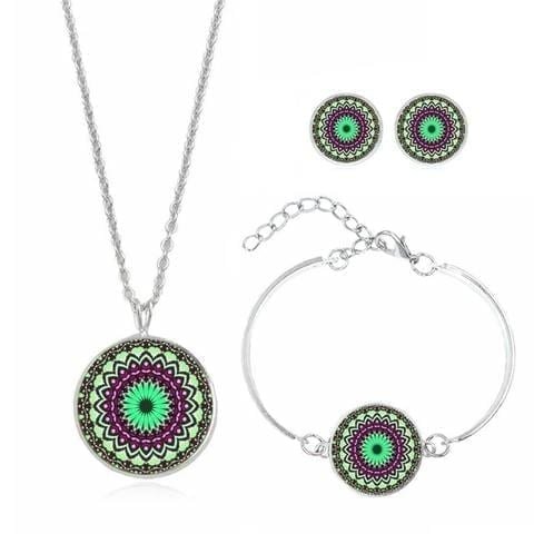 Mandala Colorful Green Bohemian Necklace Bracelet and Earring 3pcs Set